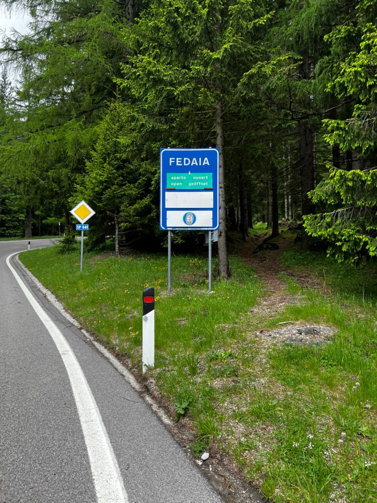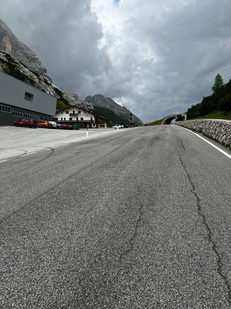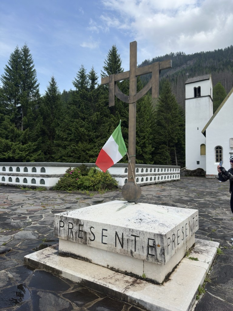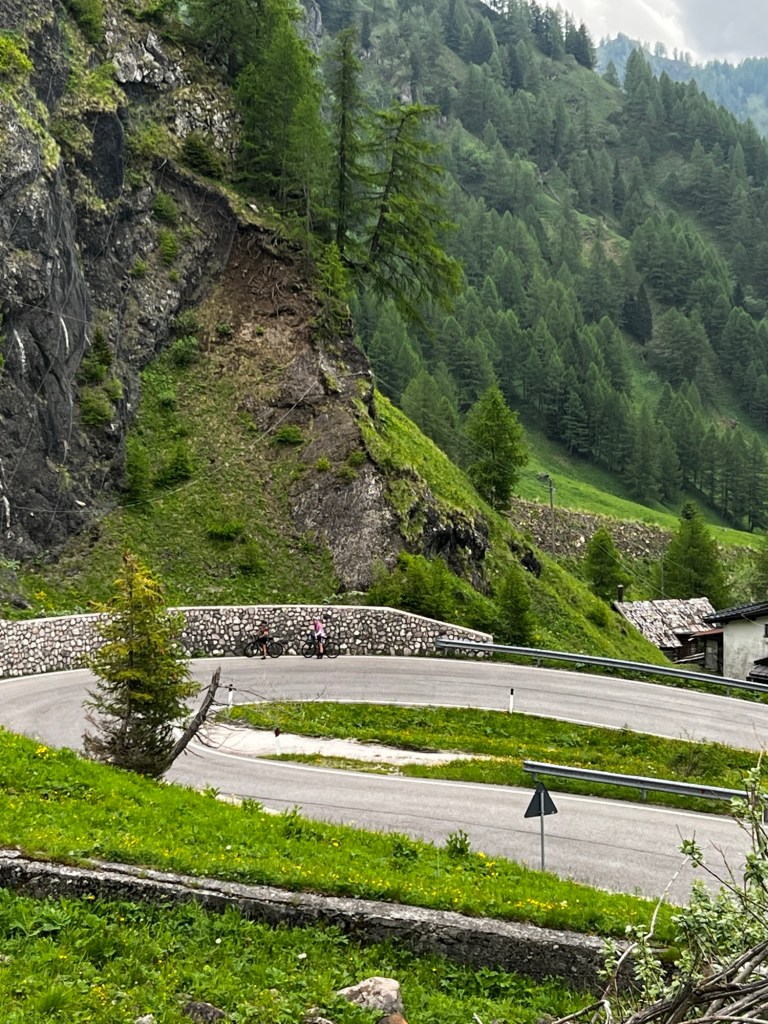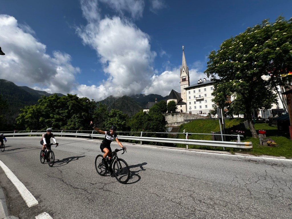Getting rained on the Falzarego descent because we took too long at the war memorial church.”