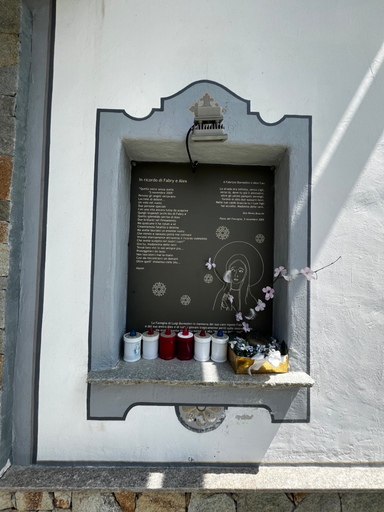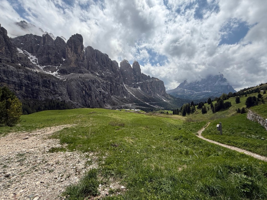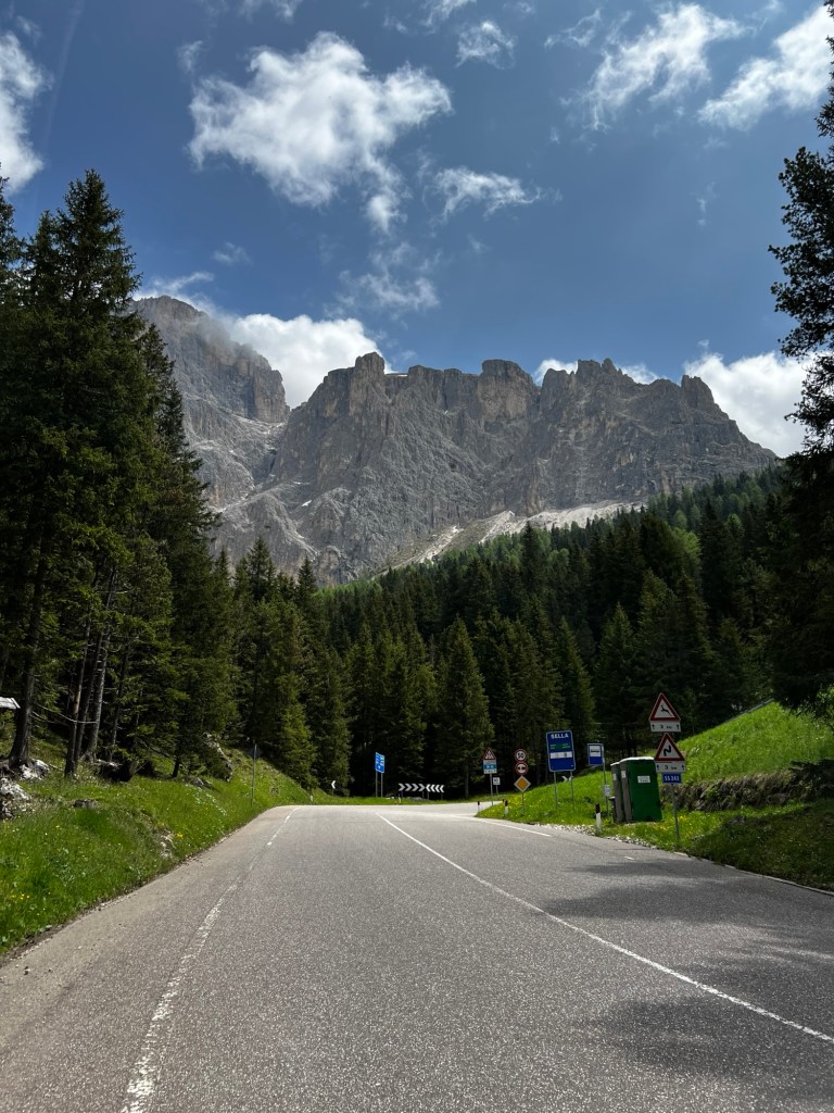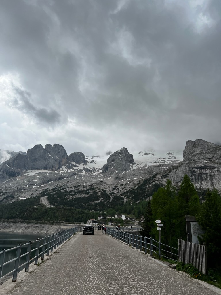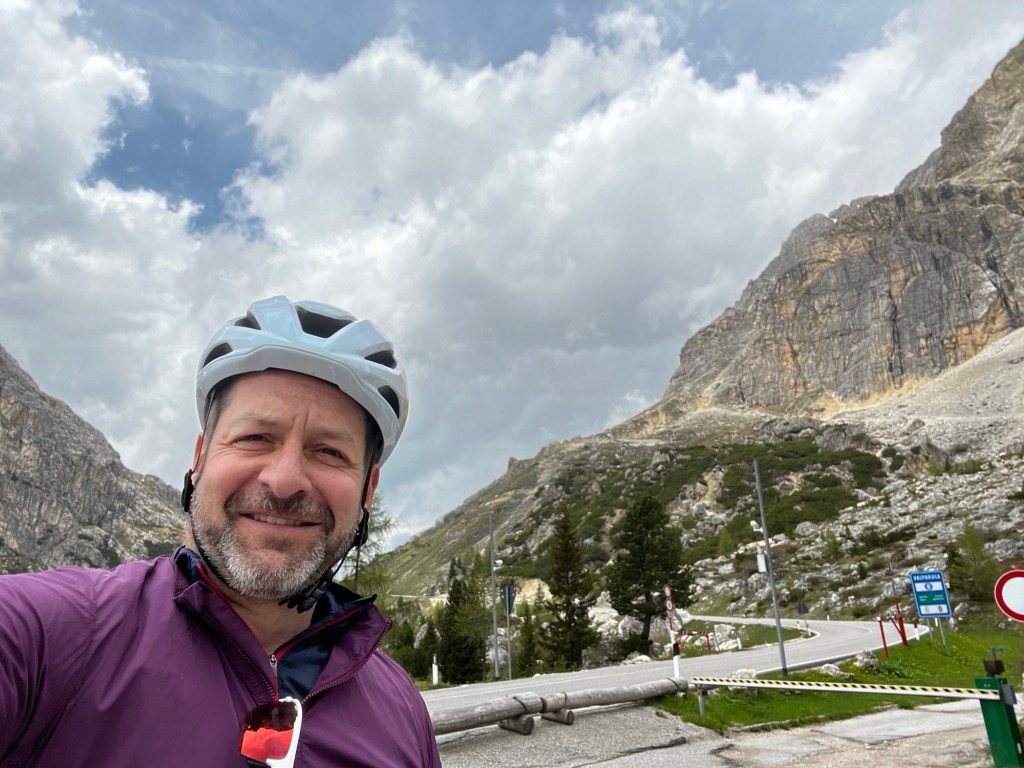 Getting rained on the Falzarego descent because we took too long at the war memorial church.”