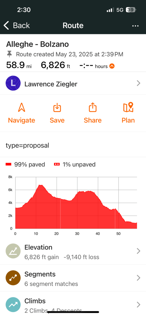 My summit races with Ken at the top of the summits out of Alleghe. Each one ends with Ken winning and me having an excuse (it’s not manly to sneak attack; the climb when Garmin says it ended, not when it levels off; he deviated dangerously from his line and almost took me down — that one I take as a legitimate win)