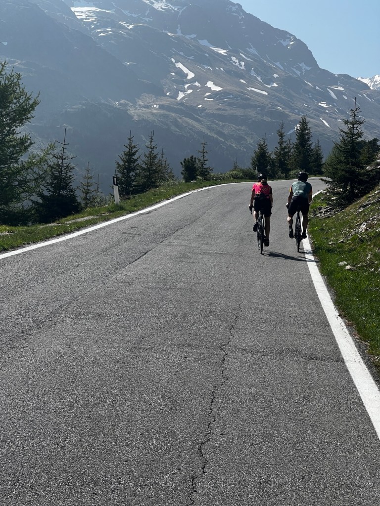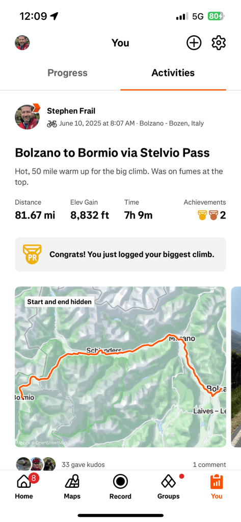 I also had a big hug with Steve at the top of the Stelvio. As much as I was relieved to have completed that climb I could see that Steve was more fulfilled than relieved. Though I am not as steeped in professional cycling lore as others and so didn’t have the same expectations for the Stelvio, it was infectious to see how joyous Steve and some of the others were at being up there.