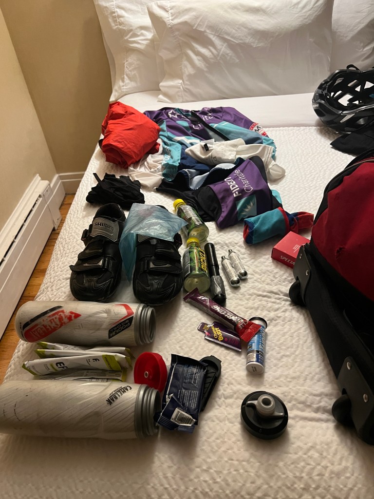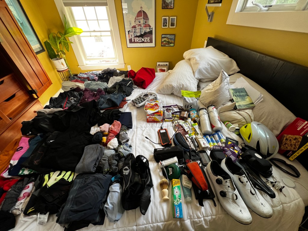 You’ve got to choose what kit to wear each day, what your nutrition and hydration plan will be, what comfort items to bring, what to wear after the ride, what electronics to carry and how to charge them. The checklist is long. And then you have to organize it all to make sure you have what you need when you get up at the crack or dawn to ride. for some reason I enjoy this.