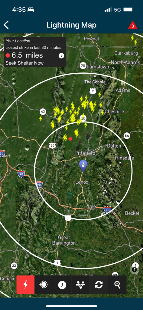 This morning’s forecast suggests the bulk of the rain will pass by 6:30 am which is when we get on the bikes at the NY border. Rain I can deal with…lightning I cannot. So, keep on moving, storm.