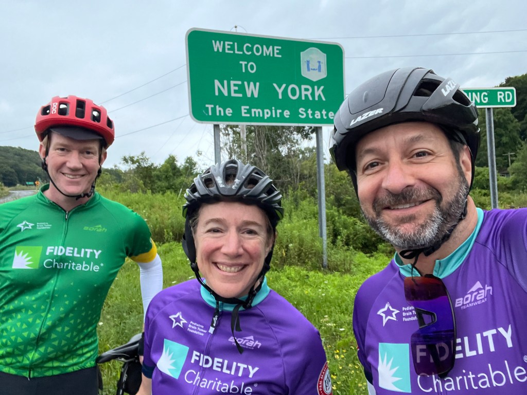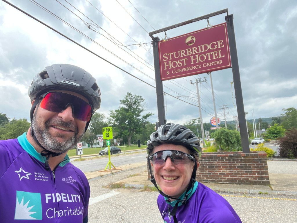 This year I’m riding an extra day — Day 0 — an unofficial ride before the ride. Dozens of us will depart early on Friday from the NY-MA border to ride 95 miles to Sturbridge, MA, where the original PMC course begins. That’s where I am heading now — staying overnight in Lenox, MA so we can get an early start in the morning. I’m fortunate to have two PMC teammates that wanted in on this bonus mileage, too, and volunteered to drive us out. Let’s GOOOOOO!