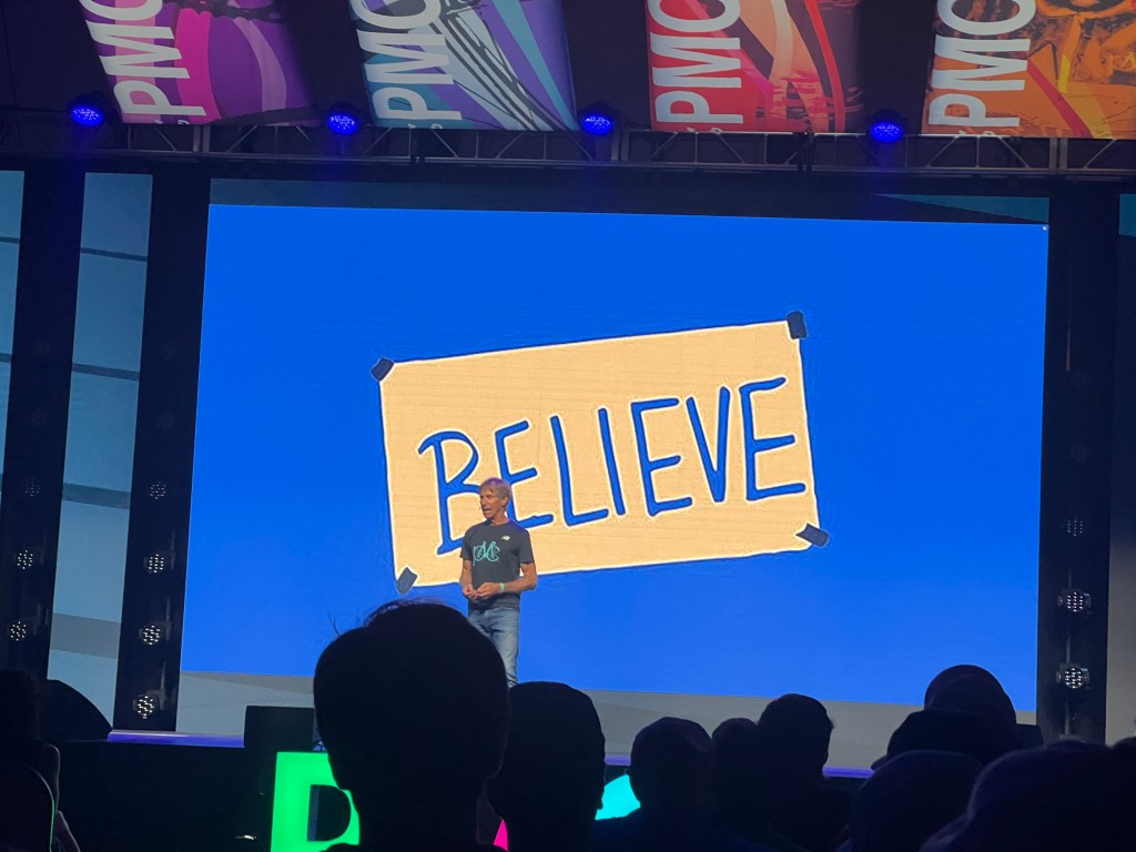 As other riders checked in the lot filled up quickly with bikes. Behind the hotel, food and beverages were served while friends new and old gathered to swap stories and plan for the weekend’s rides. Dusk came all too quickly, and many of us headed into the convention center ballroom attached to the hotel to watch the opening ceremonies, headlined by Billy Starr, the founder of the PMC. Billy started out by comparing PMC weekend to the hit show, Ted Lasso, because there is just so much goodness and compassion all around, and no matter what the challenge is, we come together and find a way. It was a cool moment.