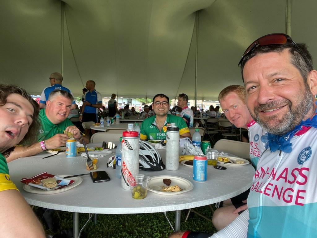 Over the day, I rode with a variety of people, and enjoyed the scenery. Rest stops were a great place to connect with friends. The Dighton High School rest stop is also where the riders from Wellesley first have a chance to connect with the riders from Sturbridge. We found some more Fidelity riders there. And we ate pickles, because that’s what cyclists do.