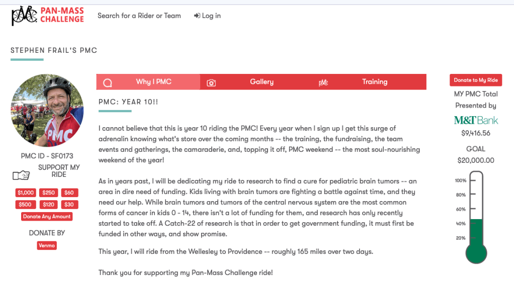 For the past several years I have ridden a Fidelity PMC team that directs its fundraising to the Pediatric Brain Tumor Foundation within the Dana-Farber Cancer Institute. I became involved with this particular foundation through a friend and neighbor whose son has been living with a brain tumor since he was very young. Before the PBTF was founded there was almost no research into pediatric brain tumors, the most common kind of cancer in childhood. Today, thanks to years of fundraising by organizations such as the PBTF there are many promises lines of research and treatment for these tumors, and those treatments are far less toxic to children. My friend’s son is now in college, a testament to the doctors at Dana-Farber.