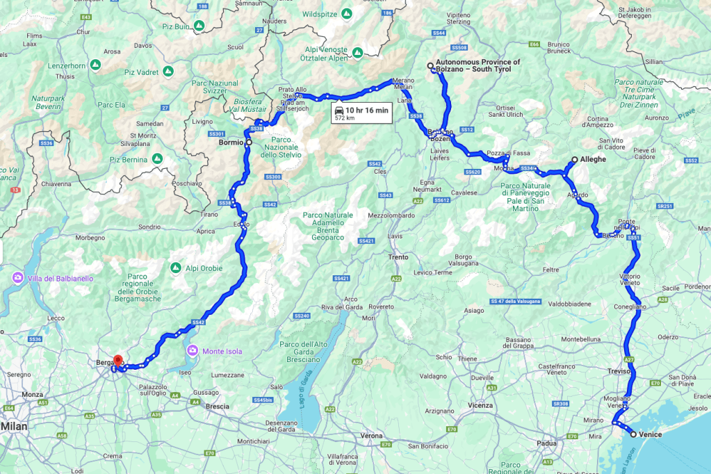 While Italian citizenship may not be in the cards, the pull to see more of Italy remains strong. I’ve seen parts of Florence, Rome, and Milan, but the rest of the country is still on my “to do” list. This cycling adventure will take me along the very top of Italy, from Alleghe to Bolzano and then on to Bormeo. We will be very close to Switzerland and Austria at some points of the journey. We land in Venice and leave from Milan but I will spend no time in either city. The map below shows the most direct route via cars but does not represent the actual route we will take.